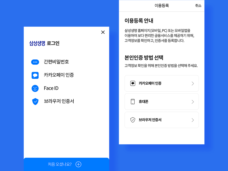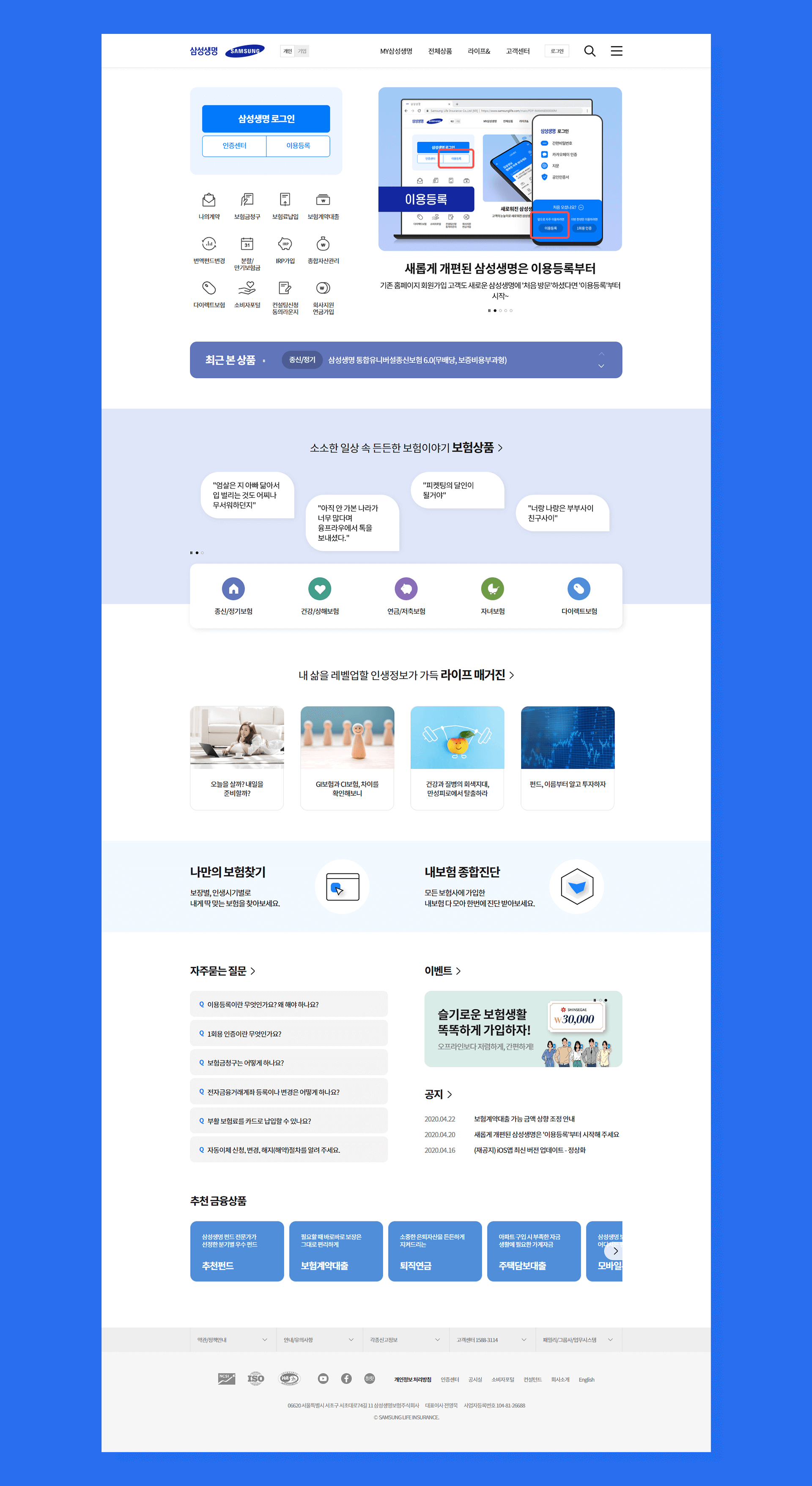 보험 웹사이트 대다수를 차지하는 업무 화면은 모바일 한 벌로 데스크톱까지 확장해 사용하되 디자인상 어색하지 않게 하였다. 합리적인 컴포넌트 형식의 디자인 가이드로 불필요한 화면 구성 고민을 줄였으며 디자인이 필요한 화면 수도 줄였다.